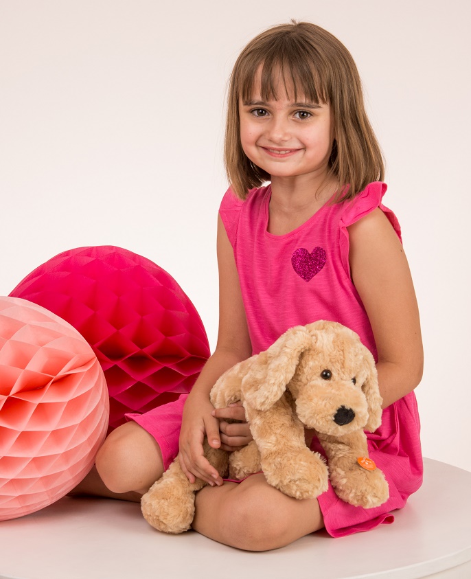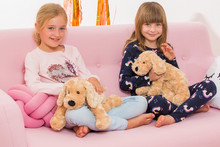Der beigefarbene Hund lässt sich dadurch sehr gut knuddeln! Einfach süß mit den großen Knopfaugen und dem weichen Fell.
