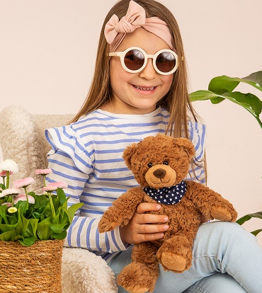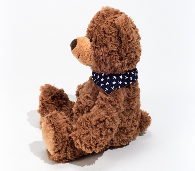 Ein klassischer brauner Teddy Bär mit ganz liebem Gesicht und Knopfaugen. Er trägt ein gepunktetes Halstuch und ist kuschelig weich.