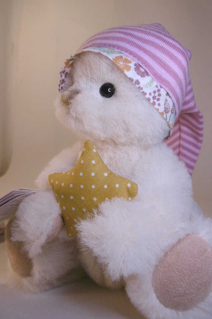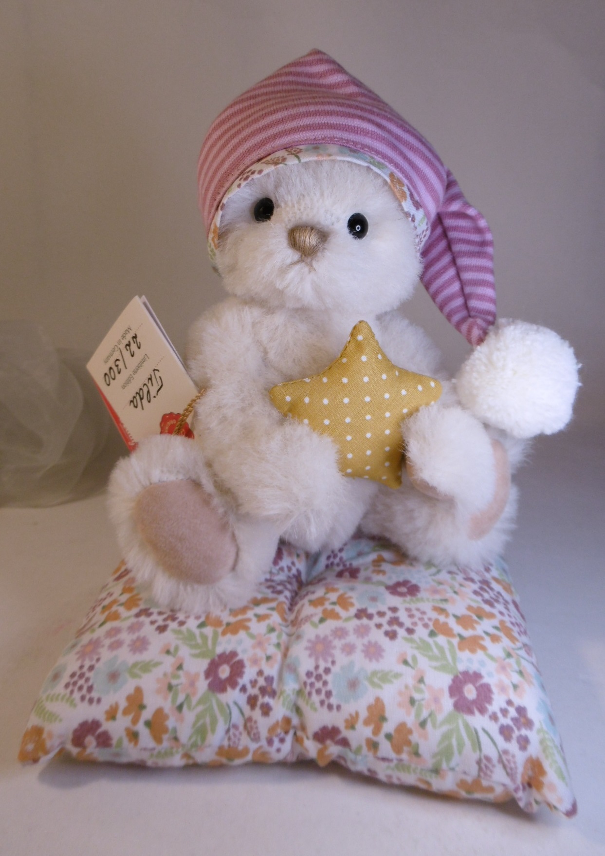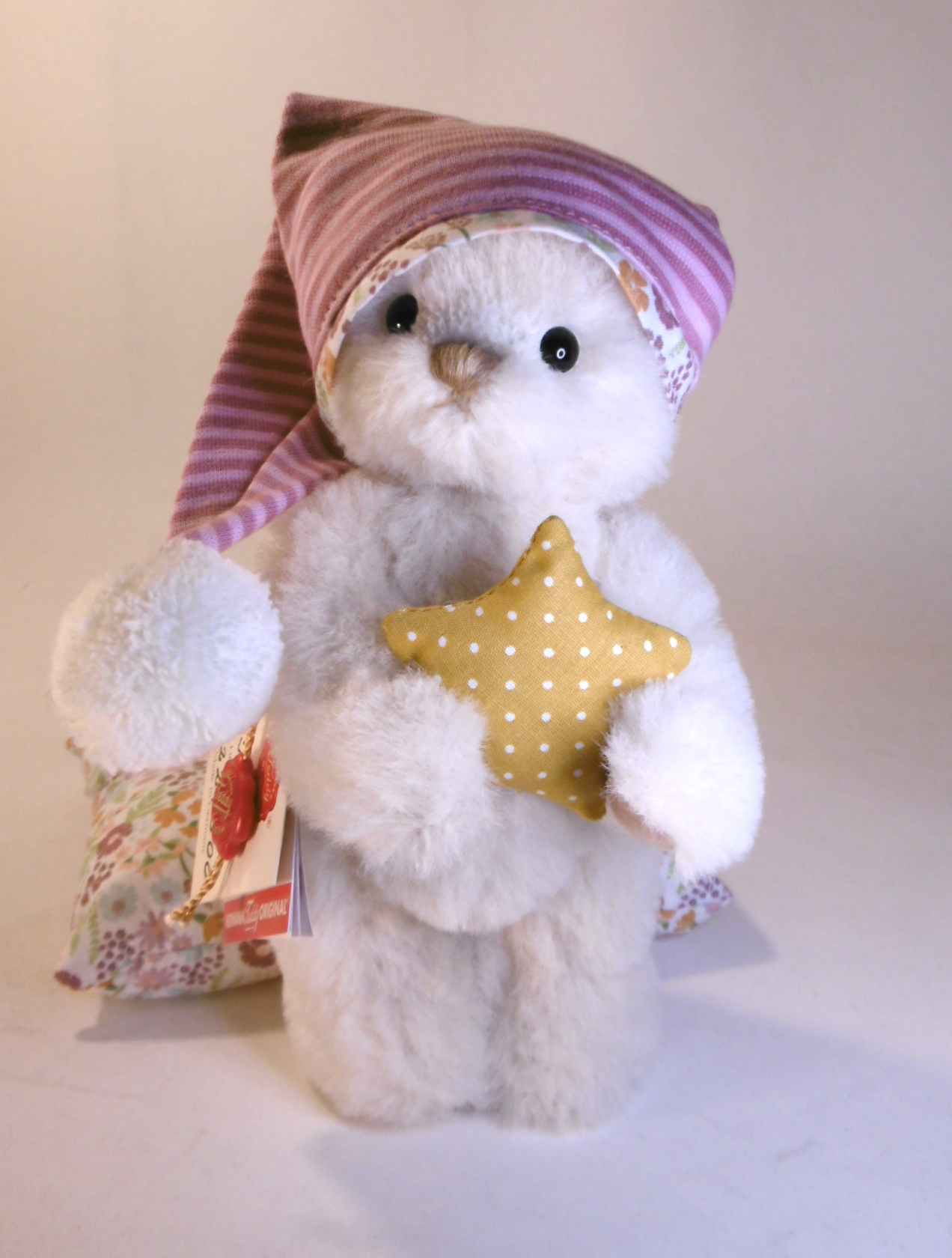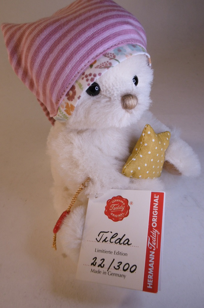 Bärenkind Tilda ist ein wertvoller Sammlerbär, ein Hermann Teddy original. Das Bärenmädchen Tilda ist 20 cm hoch und trägt eine rosa geringelte lange Zipfelmütze. Es ist eine Schlafmütze, ein kleines Sternenkissen und ein geblümtes Schlafkissen hat Tilda auch dabei.