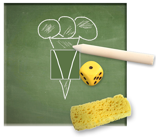 • Inhalt: Spielanleitung, Kreidetafel, 46 Kritzelkarten, 2 Joker, 1 Würfel, 1 Schwamm, 1 Kreidestift