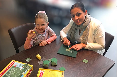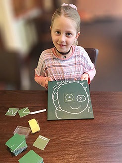 Ausganspunkt ist ein kleines Musterkärtchen, das in die quadratische Aussparung der Maltafel gelegt wird. Darauf ist z.B. ein Punkt und ein Kreis abgebildet, zwei schräge Linien oder ähnliches. Und nun geht es los: was kann daraus gezeichnet werden? Eine Eistüte? Ein Gesicht? Und wer rät es als erstes?