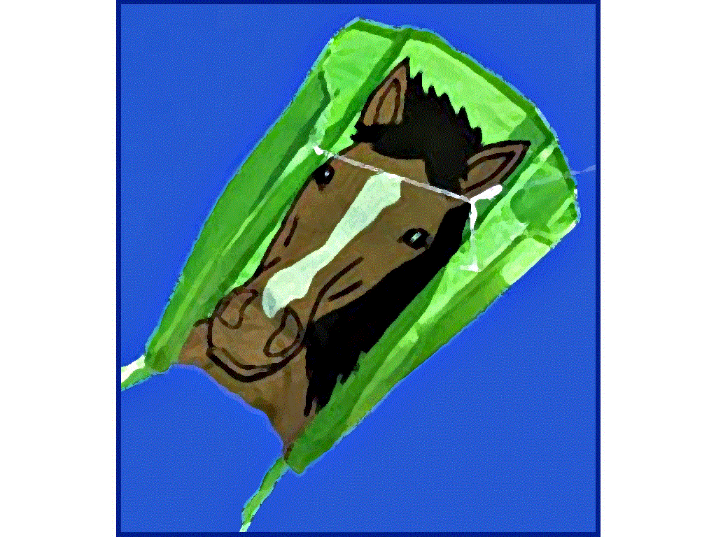 Kleiner einleiniger Kinder-Drachen mit Pferd-Motiv. Er misst 43cm x 33cm und ist aber trotzdem incl. Schnur in einer nur 7cm großen Reißverschlußtasche verpackt. Ein idealer Reisedrache - alles dabei!