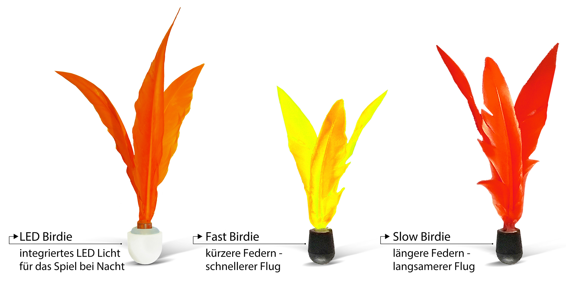 Ein Ersatzset Jazzminton Birdies mit 3 Stück. Alle aus dem Spiel sind dabei: 1x slow = rot / 1x fast = gelb / 1x LED = orange