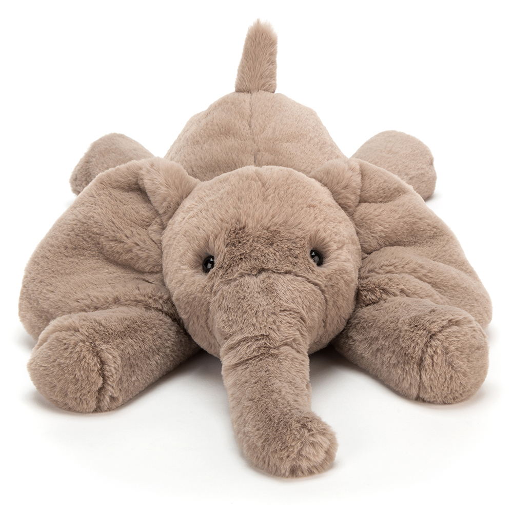 Der große liegende Plüsch-Elefant lädt zum Entspannen ein. Das Jellycat Stofftier Smudge Elephant large ist sehr weich und knuffig, da kann man sich auch mal wie auf ein Kissen draufkuscheln.