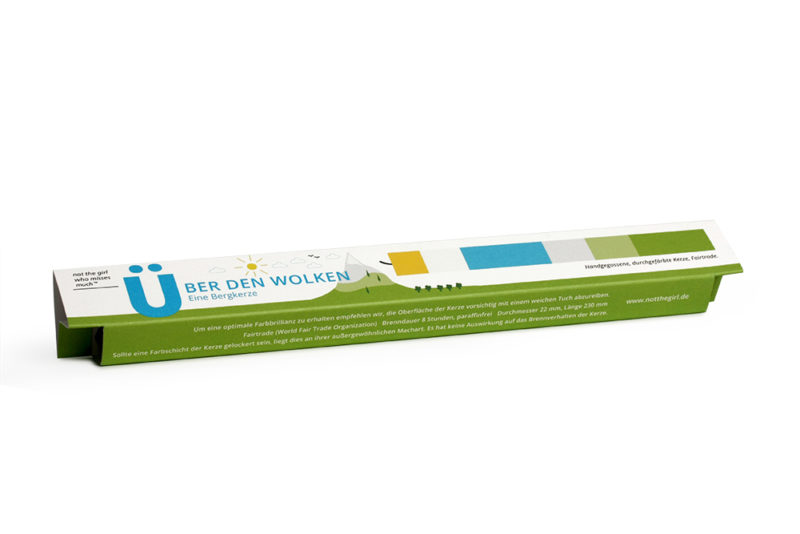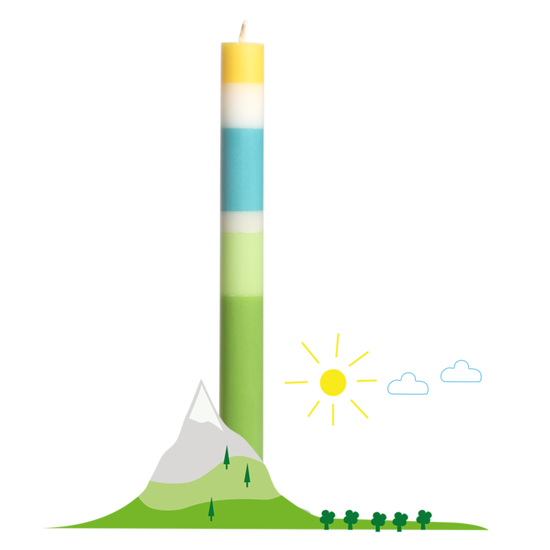 Das ist die Berg-Kerze Über den Wolken in den Farben der Bergwelt - grüne Almen, blauer Himmel, gelbe Sonne, weiße Wolken und Gipfel. Eine wunderschöne handgemachte Kerze mit langer Brenndauer, Gruss-Botschaft und ganz besonderer Optik von not the girl who misses much.