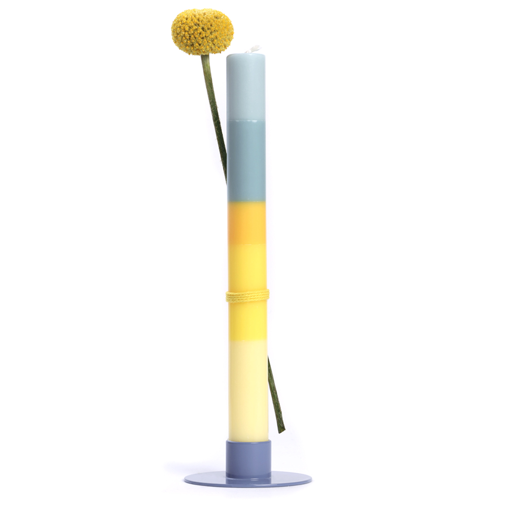 Eine colourblocking Kerze mit bunten Abschnitten in Graublau, und Gelbtönen.
