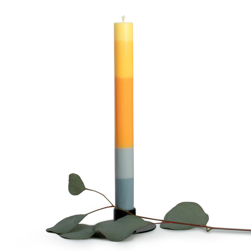 Eine colourblocking Kerze mit Abschnitten in Grau, Gelb und Orangetönen.