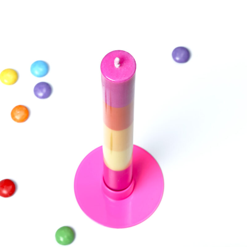 Eine Kerze im colourblocking Look mit bunten Segmenten in Pink-Orange-Gelb-Tönen, eine würdige Anlasskerze!