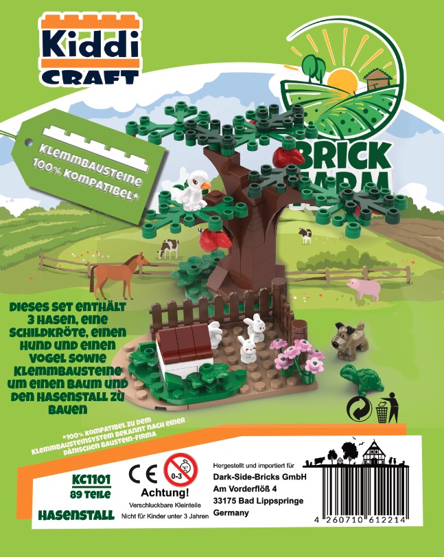 Der Hasenstall von KiddiCraft ist ein niedliches Klemmbausteinset und lässt beim Zusammenbau einen kleinen Streichelzoo entstehen. 3 Hasen sitzen fröhlich mümmelnd in ihrem Gehege, während der Hund aufpasst, dass ihnen nichts geschieht. Der Vogel trällert vom Baum herab und die Schildkröte hilft beim Verputzen des Grüns. Vielleicht fällt ja auch mal ein Apfel vom Baum?! Eine schöne Szenerie für kleine WeltenbauerInnen.
