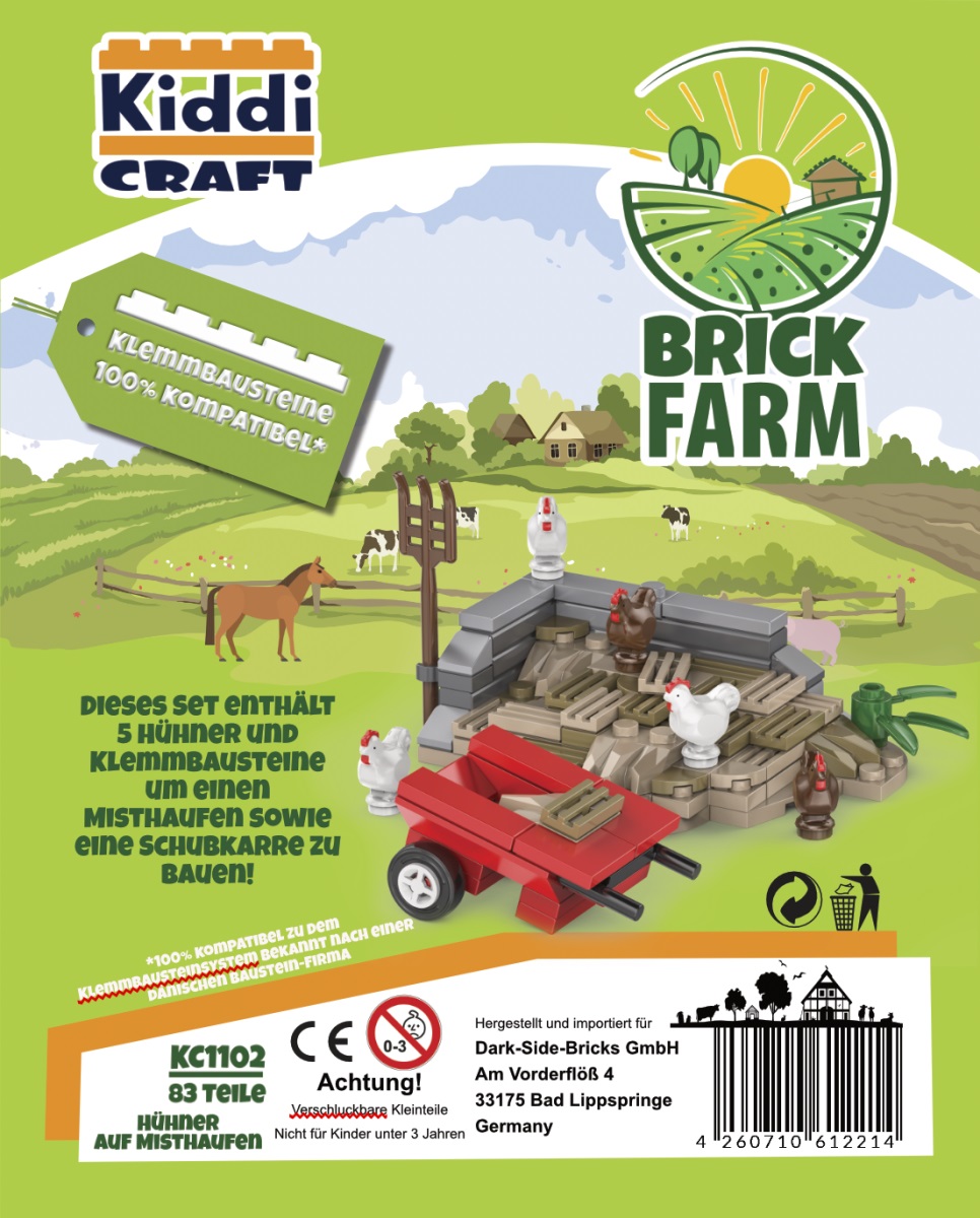 Das KiddiCraft Klemmbausteinset Hühner auf Misthaufen ist ein weiteres neues Set. Zu jedem ordentlichen Bauernhof gehört eben auch ein Misthaufen. In diesem Fall erkunden die frechen Hühner den Haufen und fragen sich, wo der Bauer eigentlich bleibt. Doch der hat seine Gabel erstmal abgestellt und ist wahrscheinlich zum Kaffee nach Hause getreckert. Eine schöne Szenerie für kleine BäuerInnen.