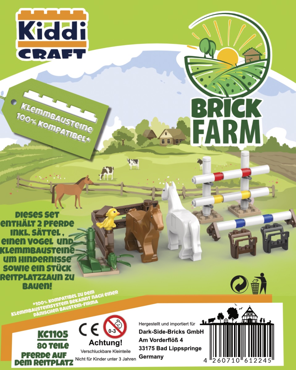 Eine eigene kleine Reitszene bauen, das geht mit dem KiddiCraft Klammbausteinset Pferde auf dem Reitplatz ganz wunderbar. Das braune und das weiße Pferd können sogar gesattelt werden. Hopp, und auf geht es über die Hindernisse, während der gelbe Vogel staunend zuschaut. Das Set lässt sich prima mit den anderen KiddiCraft-Bauernhof-Sets kombinieren und so entstehen blühende Landschaften.