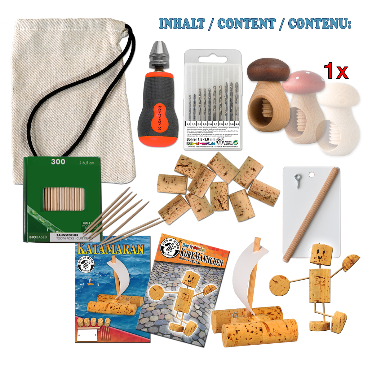 Mit viel Freude eifern Kinder ihren erwachsenen Vorbildern beim Tüfteln und Handwerken nach – und Kids at Work hilft ihnen dabei durch eine tolle Kollektion an Werkzeugen und kreativen Bastelmaterialien. Akkuschrauber, Hammer und Co. sind dabei voll funktionsfähig. So können sich ältere Kinder - natürlich die Aufsicht von Mama oder Papa vorausgesetzt – voller Stolz an ihre eigenen Projekte wagen.