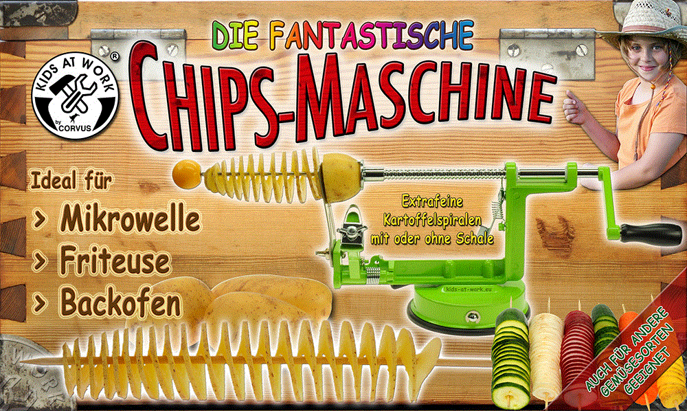 Achtung, die Schäl- und Schneidemesser sind scharf! Es sollte immer ein Erwachsener die Nutzung der Chipsmaschine beaufsichtigen oder durchführen. Kein Kinderspielzeug!