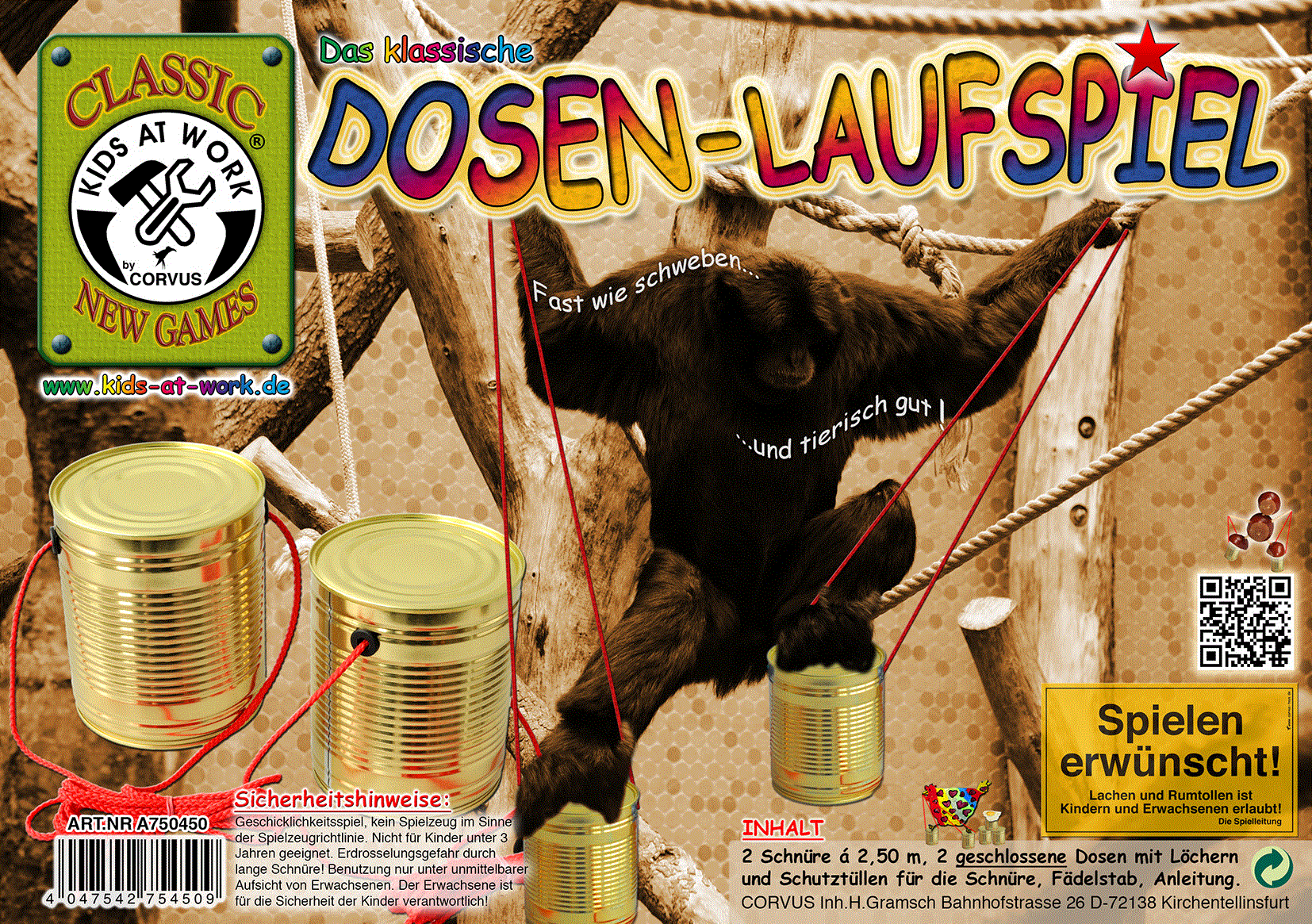 Diese Variante von Kids At Work ist besonders dekorativ und nostalgisch, da hier echte geschlossene Lebensmitteldosen verwendet werden. Das macht nochmal deutlich, dass Dosenlaufen eine ganz alte klassische Art des Kinderspiels ist, ein Evergreen.