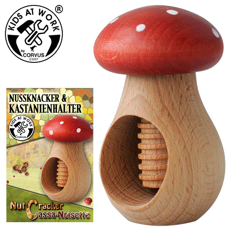 Die Nuss wir einfach in die große Öffnung gesteckt und dann das Holzschraubgewinde so lange heruntergedreht bis es knackt! Das können auch schon Kinder.