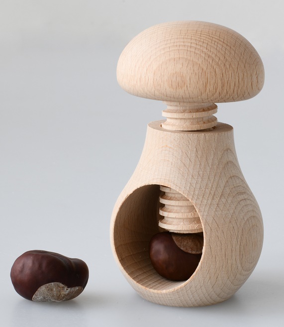 Die Nuss wir einfach in die große Öffnung gesteckt und dann das Holzschraubgewinde so lange heruntergedreht bis es knackt! Das können auch schon Kinder.