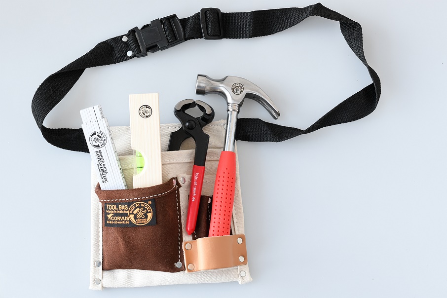 Der Werkzeuggürtel von Kids At Work sieht sehr professionell aus. Der Werkzeug-Inhalt ist zwar kleinformatiger als bei den Erwachsenen, aber von toller Qualität.
