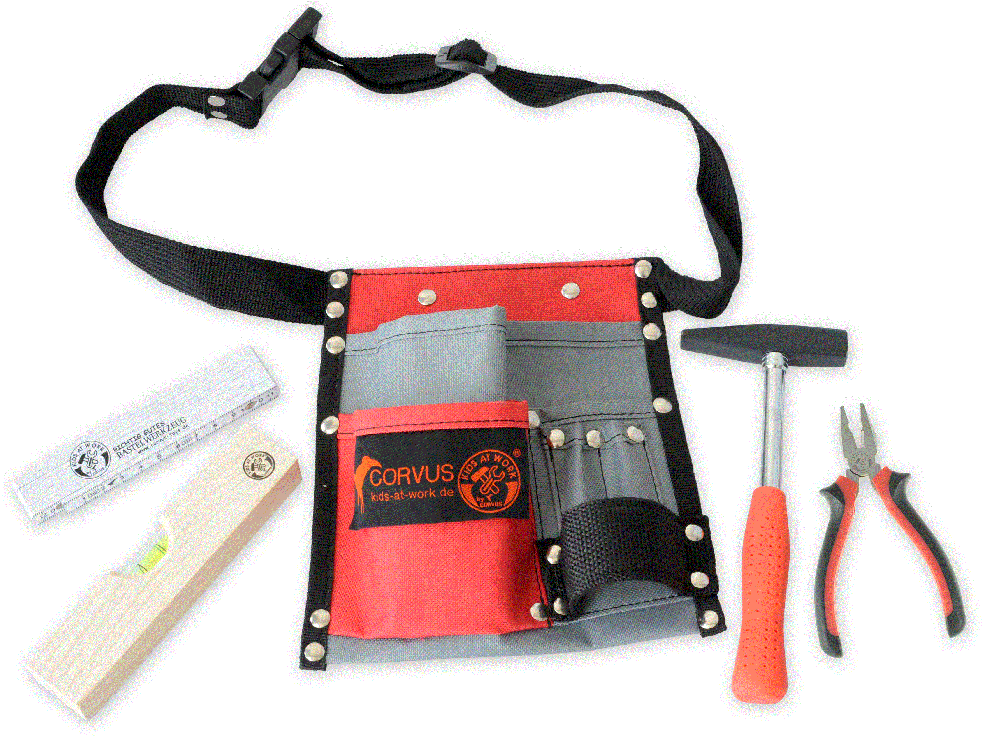 Befüllter Werkzeuggürtel mit Hammer, Kombizange, Meterstab und Wasserwaage. Ein toller Einstieg in die Welt des Heimwerkens für alle Kinder - darf bei keiner kreativen Aktion fehlen!