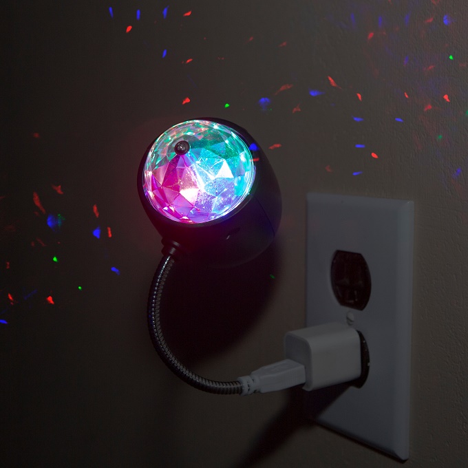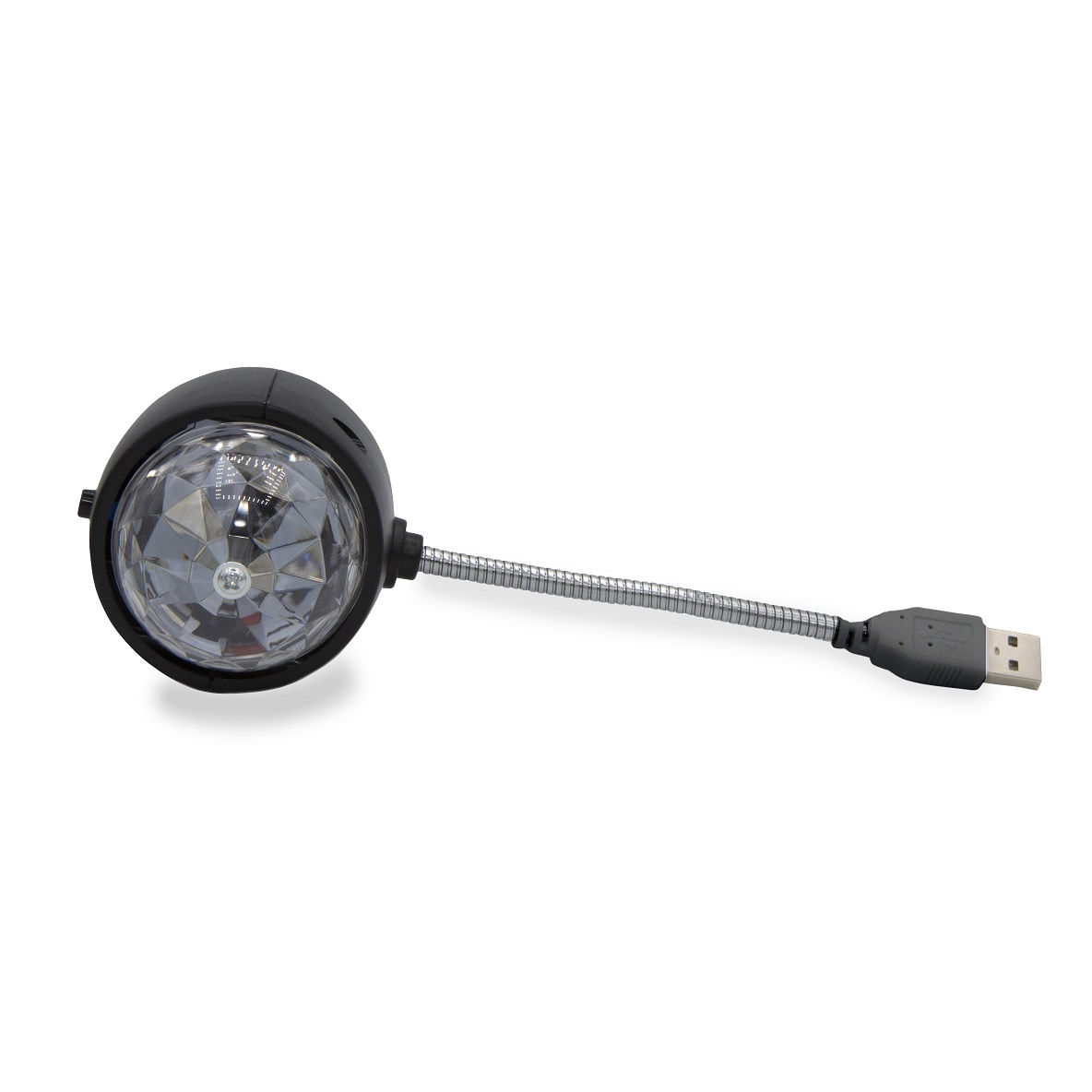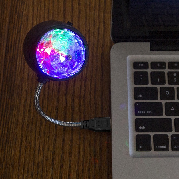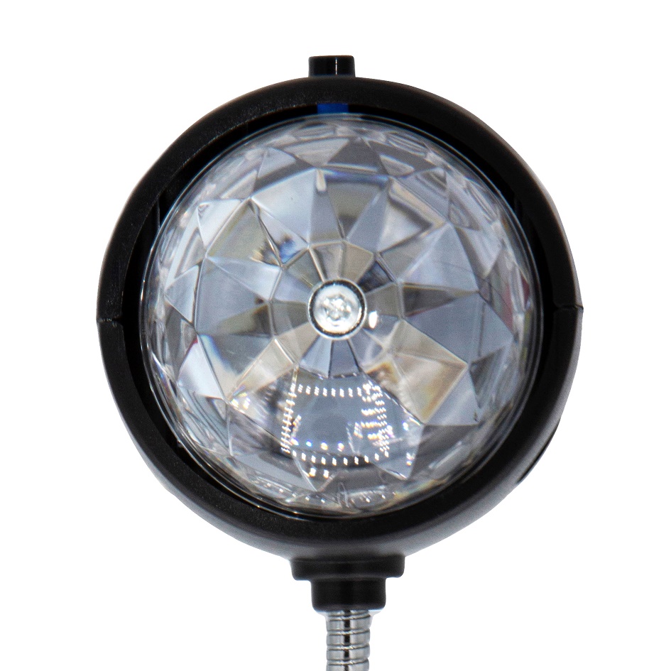 Diese Discoleuchte mit hellen bunt tanzenden LEDs hat einen USB-Anschluss. Es gibt einen An-Aus-Schalter und eine Schwanenhals-Halterung.
