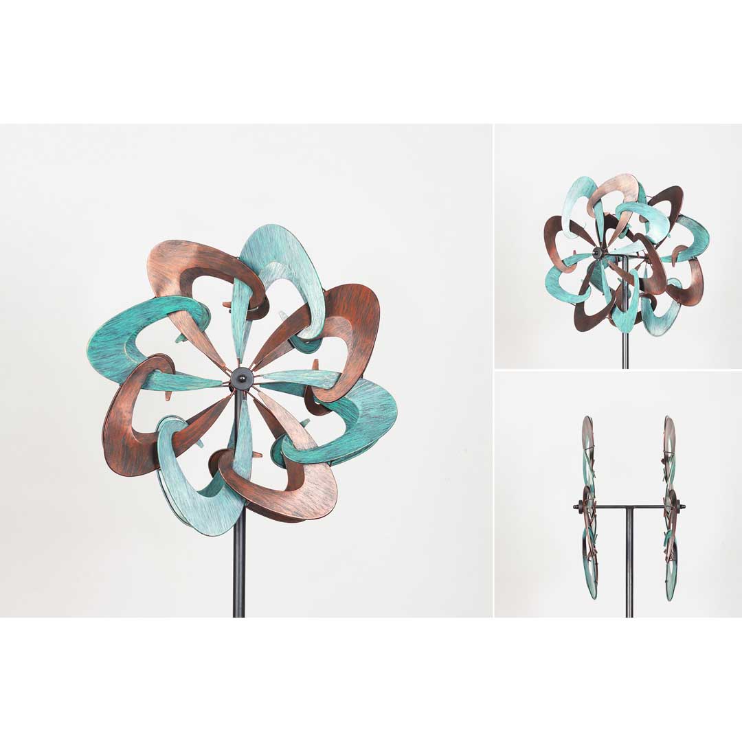 Aus Metall sind diese wunderbaren Kinetic Art Windspiele hergestellt. Copper Swirl Duett hat zwei unabhängig voneinander drehende Rotoren in bronzefarbener und grüngebürsteter Patina. Sehr schick im Garten.