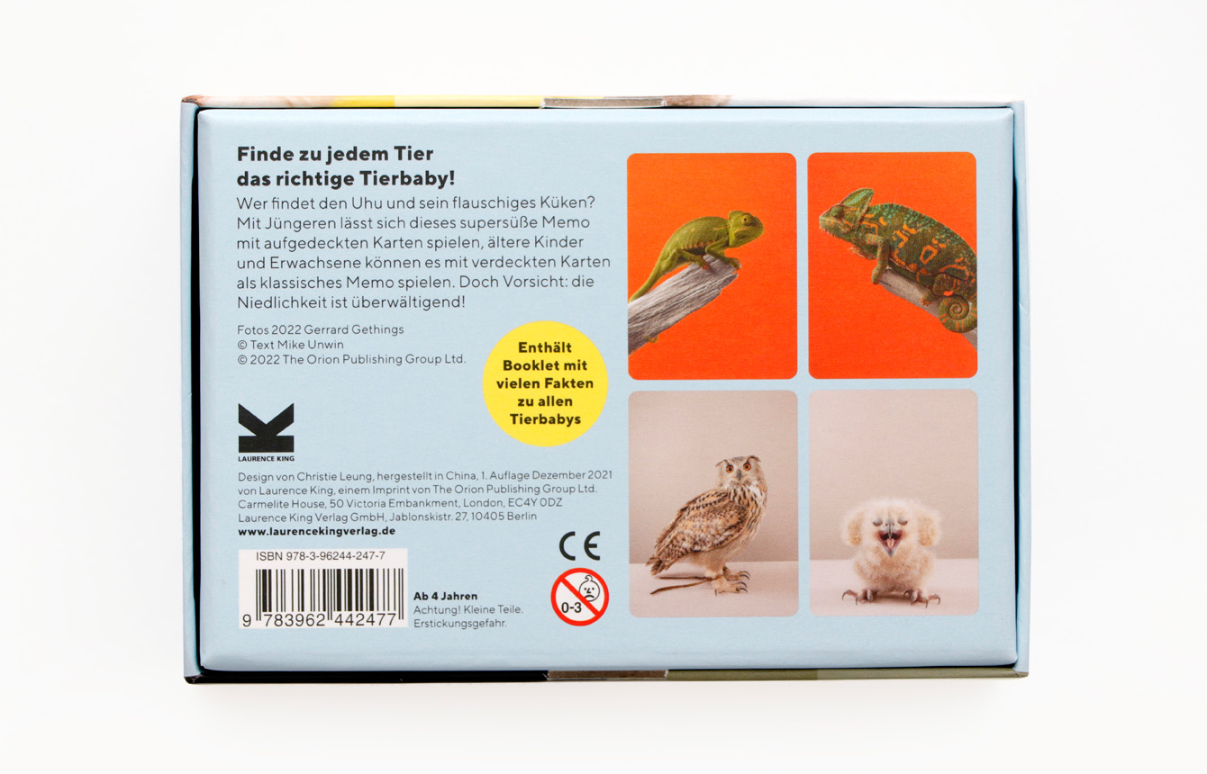 Beim Klein und groß Tierbaby -Memo geht es um einen guten Blick fürs Bild – und um niedliche kleine Tiere! 25 Paare aus erwachsenem Tier und Nachwuchs müssen zusammengelegt werden. Ganz nebenbei erfahren die Spielerinnen und Spieler etwas über die die verschiedenen Tierarten. Ein spannendes Booklet ist dabei! Übrigens: Das Memo-Spiel lässt sich auch in einem reduzierten Schwierigkeitsgrad von Kindern spielen! Einfach die Karten aufgedeckt lassen und die passenden Tiere zusammensuchen. Auch sehr lustig!