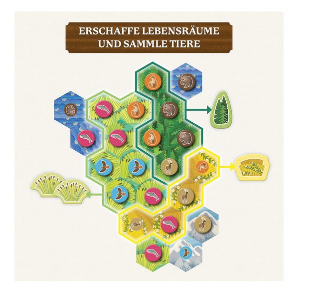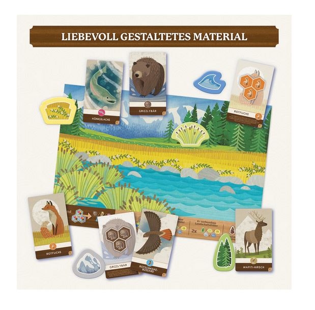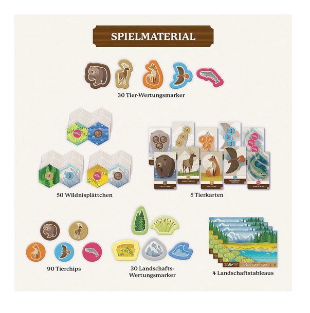 • Inhalt: 50 Wildnisplättchen, 90 Tierchips, 30 Landschaft-Wertungsmarker, 30 Tier-Wertungsmarker, 5 Tierkarten, 4 Landschaftstableaus, 1 Spielanleitung