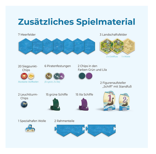 • Inhalt: 3 Landschaftsfelder, 7 Meerfelder, 2 Rahmenteile, 1 Hafenplättchen, 30 CATAN-Chips, 15 lila Spielfiguren, 15 grüne Spielfiguren, 2 Aufsteller, 1 Anleitung