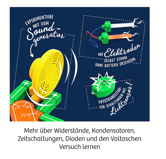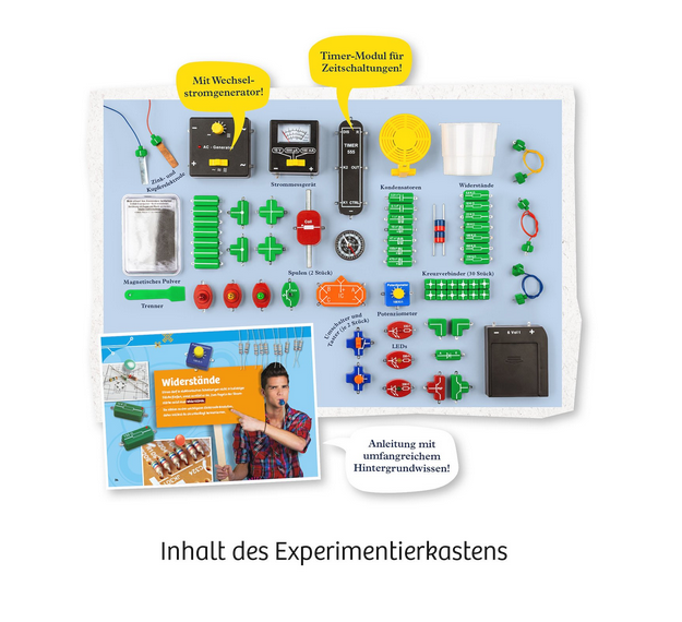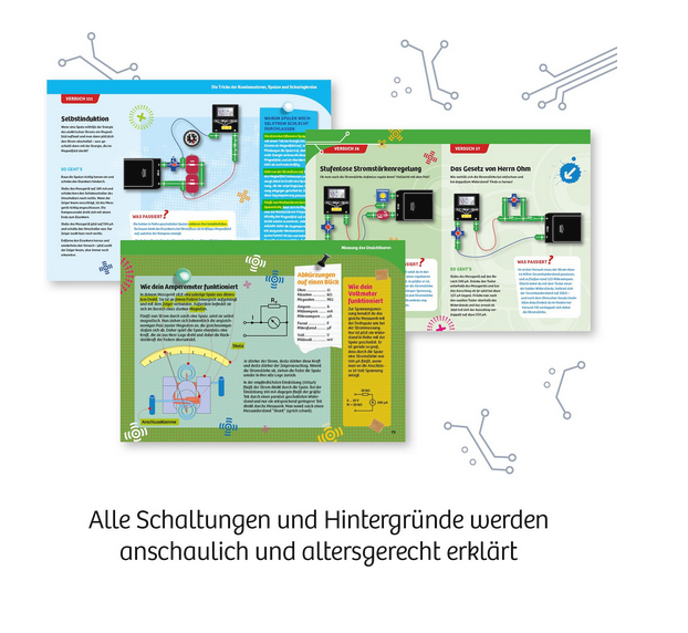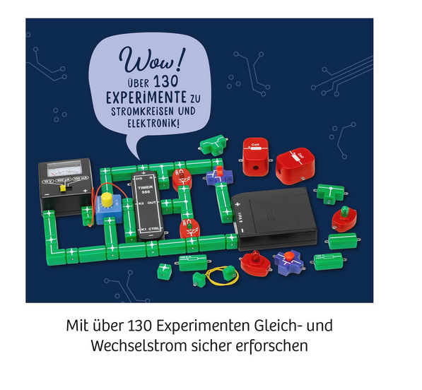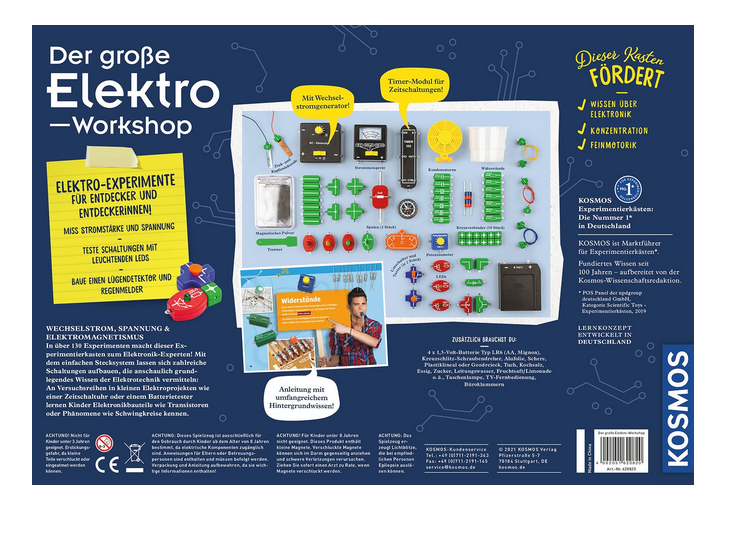 Der große Elektro-Workshop von Kosmos ist der ideale Start in die spannende Welt des Stroms und der Elektronik. In über 130 Versuchen bauen die Kidner aus den Bauteilen eigene Stromkreise zusammen: Schalter, Lampen, Spulen, LEDs, auch Highlights wie ein Timer, ein Strommessgerät und ein Wechselstrom-Generator und vieles mehr werden in endlosen Experimentierstunden entdeckt, kennengelernt und angewendet. Die Versuche dieses umfangreichen Lehrgangs führen von ersten Experimenten mit Strom und Spannung zu selbst gebauten Lügendetektoren und größeren Versuchsreihen. Die bebilderte Anleitung leitet Schritt für Schritt durch die Versuche, liefert ausführliches Wissen zum Thema Elektronik und regt zu selbstständigem Experimentieren an.