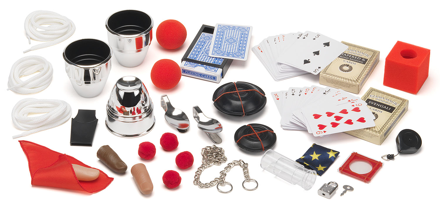 • Inhalt: Gedankenlese-Karten, Kette, Schloss mit Schlüssel, Pompons, Karten-Verschwinde-Box, Tuch, 3 Zauber-Seile, Beutel, Mysteriöse UFOs, Münzgefängnis, 3 Metallic-Becher, Svengali-Karten, Magische Löffel aus Metall, transparente Becher, ausziehbarer Scgnurstopper, Zauberbälle, Zauber-Cube, Zauberdaumen in drei Hauttönen, weitere geheime Zauber-Utensilien