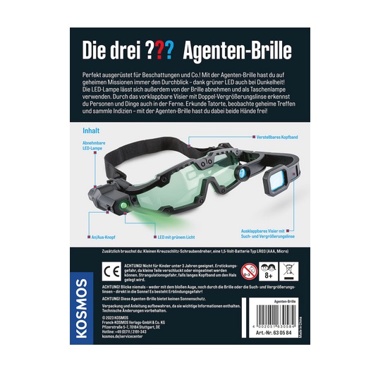 Es gibt ein klappbares Visier mit einer Such- und einer Vergrößerungslinse. Eine integrierte LED beleuchtet die Umgebung. Cool!