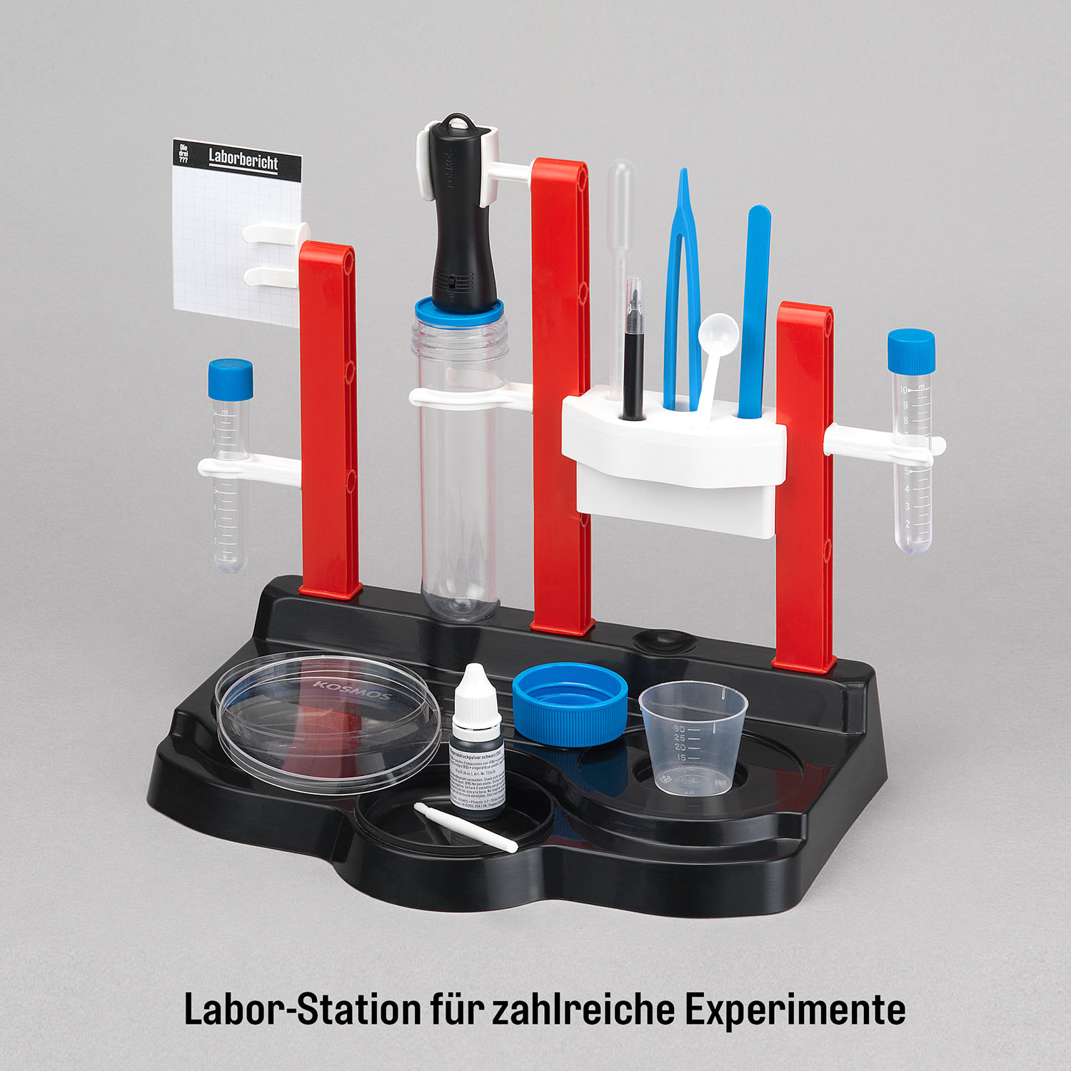 • Inhalt: 10-teilige Laborstation, großes Reagenzglas, kleine Reagenzgläser, Messbecher, Petrischale, Spatel, Pipette, Pinzette, Messlöffel, Pinsel, Notizblock, Stickerbogen, Filterpapier, UV-Lampe, Rosskastanienrinde, pH-Teststäbchen, Fingerabdruckpulver, farbig illustrierte Anleitung