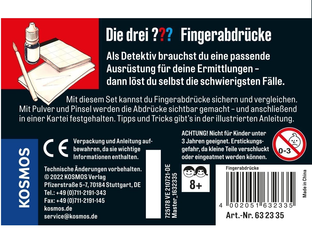 Mit diesem Set von Kosmos kann man Fingerabdrücke sichern und dem Täter auf die Spur kommen. Mit Pulver und Pinsel die Abdrücke sichtbar machen, anschließend im Karteiblock sichern und vergleichen. In der illustrierten Anleitung gibt´s Tipps und Tricks.