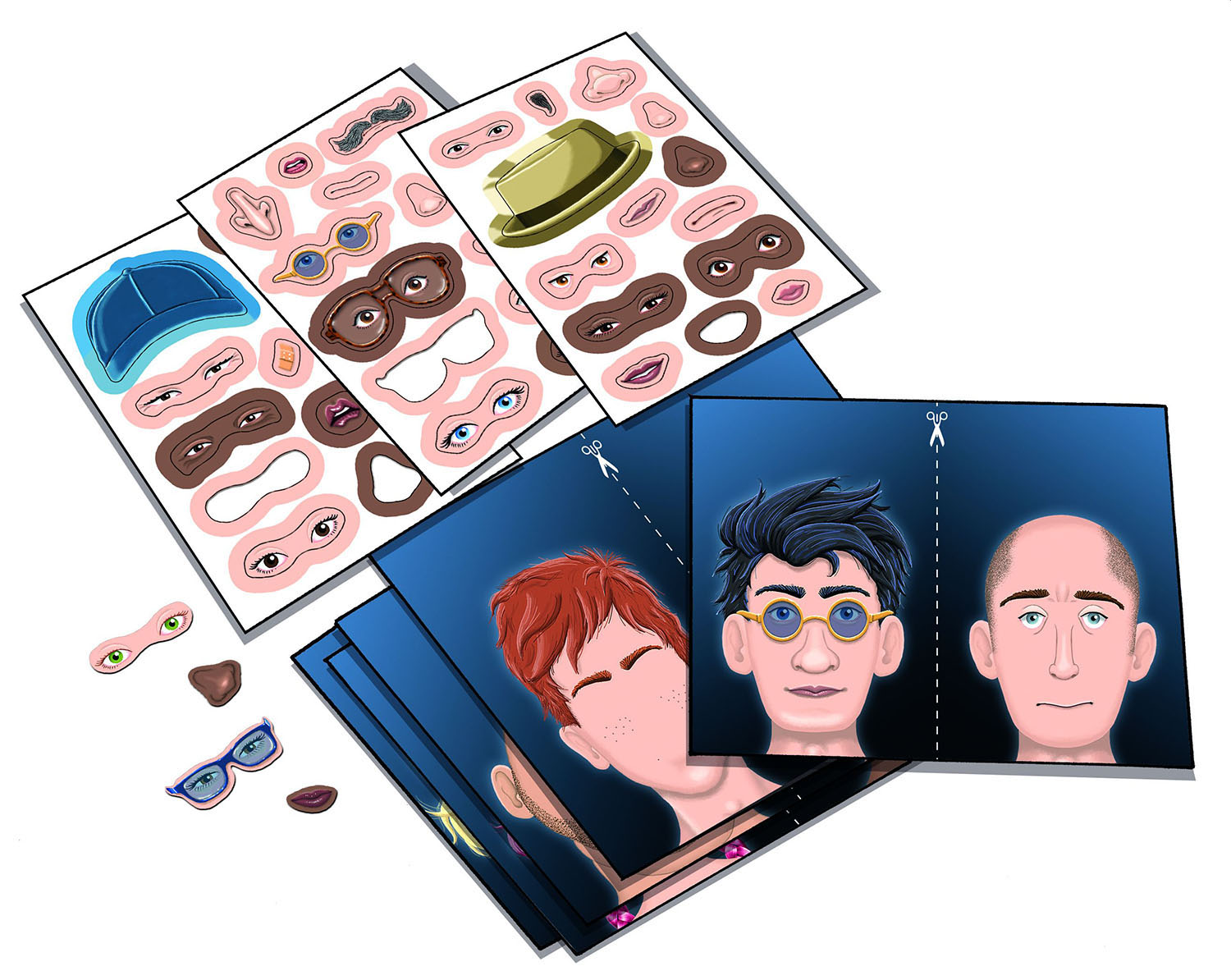 Wie kannst du anhand von Zeugenaussagen ein möglichst realistisches Bild eines Täters erstellen? Ganz einfach! Nutze die Dose als Untergrund und kombiniere die verschiedenen Magnetfolien zu einem Gesicht! Die Magnetfolien enthalten unter anderem Augenbrauen, Augen, Ohren, Nasen, Münder und Kinnformen. Dabei können auch ziemlich lustige Fratzen entstehen!