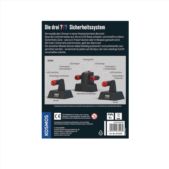Das Kosmos Die drei ??? Sicherheitssystem gibt Alarm, sobald jemand die unsichtbaren LED-Lichtstrahlen unterbricht. Spiele mit deinen Freund*innen Agentenszenen nach oder werde gewarnt, wenn Gefahr für deine geheimen Naschvorräte besteht. Die Anleitung hilft bei Aufbau und Einsatz dieses Sicherheitssystems für kleine Detektive. Sicher ist sicher.