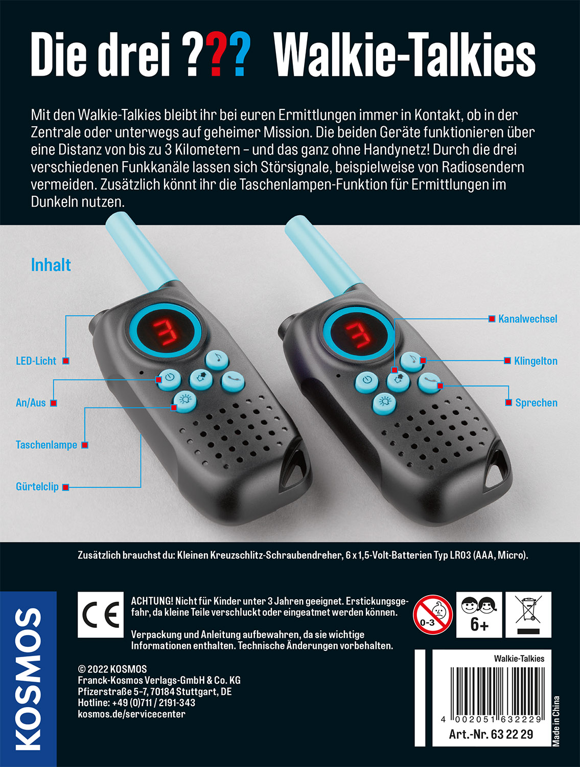 Aus der drei Fragezeichen-Reihe von Kosmos gibt es dieses geniales Funkgeräte-Set für alle Nachwuchsdetektive: Die drei ??? Walkie-Talkies.