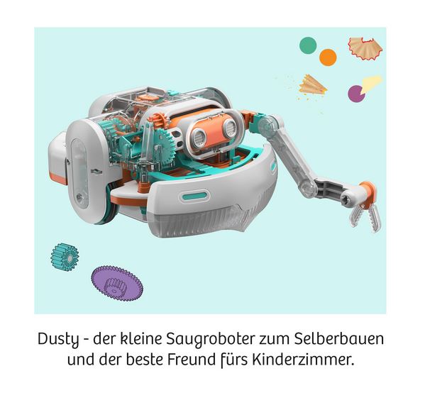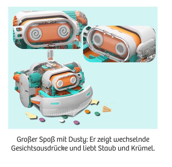 Dusty Experimentierkasten Saugroboter von Kosmos saugt deine Krümel vom Tisch, verzieht dabei sympathisch das Gesicht und passt selber auf, daß er nicht herunterfällt. Aber zuerst muß er zusammengebaut werden, das macht Spaß und dabei lernst du eine Menge über Robotertechnik. Dank transparenter Bauteile kann man sehen, was sich wie wann und warum bewegt! Ein tolles Technik-Abenteuer!