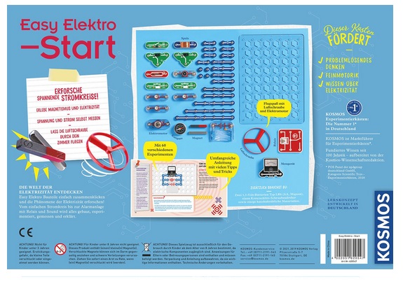• Inhalt: Basisplatte, Kontaktelemente, Batteriefach, Schalter, Taster, Umschalter, Lämpchen, Elektromotor, Relais, Summer, Messgerät, Spule. Eisenkern, Magnet, Magnetschalter, Kompass und Propeller, farbig illustrierte Anleitung