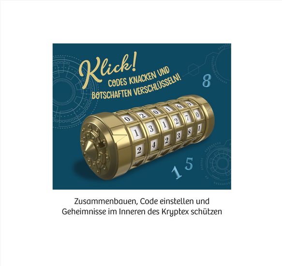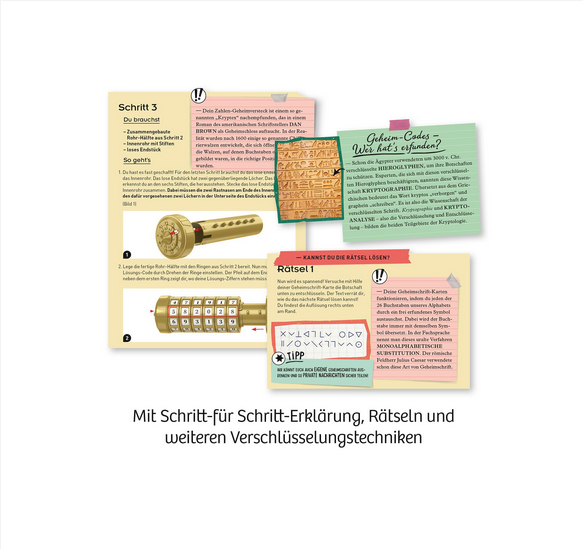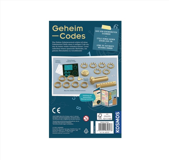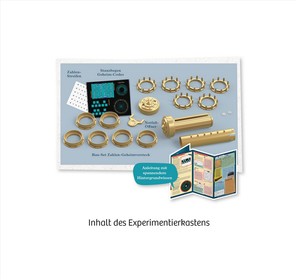 • Inhalt: Bauset aus 16 Teilen, Notfallschlüssel, Papierkartonbogen mit Zahlenstreifen, Codierscheibe, 2 Geheimschrift-Karten, 2 Code-Gitter, farbig illustrierte Anleitung