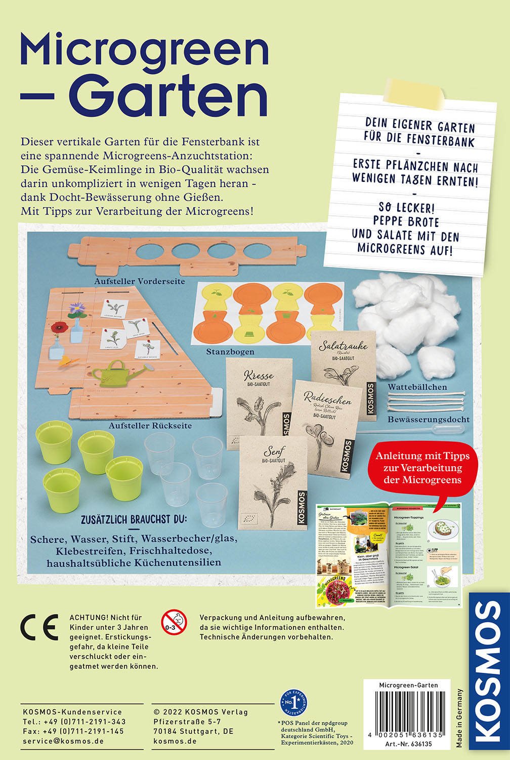 • Inhalt: 4 Töpfchen, 4 Wasserresevoirs, 4 Bewässerungsdochte, Samentütchen Kresse, Senf, Rucola und Radieschen a je 5g, 12 Wattebällchen, Kartonaufsteller aus zwei Teilen, Pipette, Stanzteile Abdeckung/Kennzeichnung, farbig illustrierte Anleitung