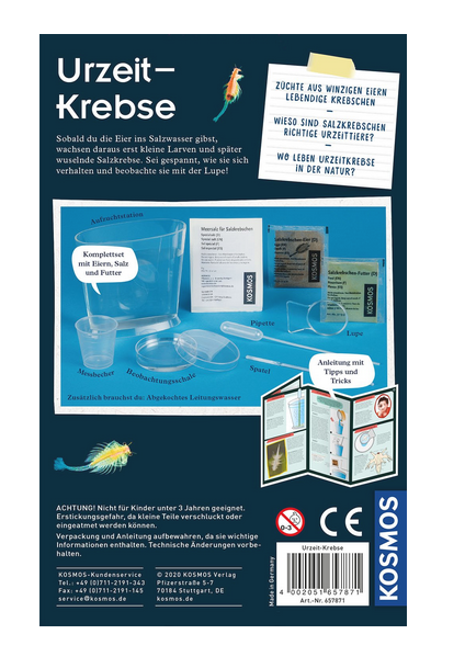 Der KOSMOS Experimentierkasten Urzeit Krebse lebt: In einem mit Wasser und Salz gefüllten Zuchtbecken erwachen die Urzeit-Krebs-Eier zum Leben. Kinder können so das Wunder des Lebens hautnah miterleben und mit der Lupe täglich mitverfolgen. Und schließlich wuseln die kleinen Krebstierchen im Becken rum! Spannend und lehrreich!