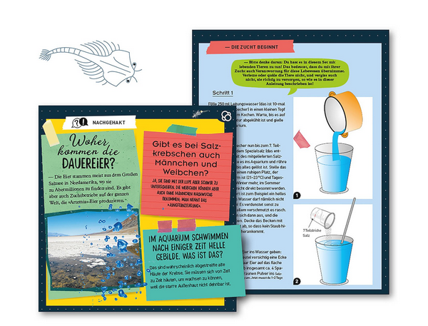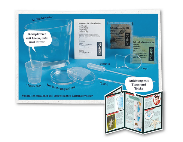 • Inhalt: Anleitung, Salzkrebschen-Eier, Futter, Meersalz, Aufzuchtstation, Messbecher, Beobachtungsschale, Spatel, Pipette, Lupe, Anleitung