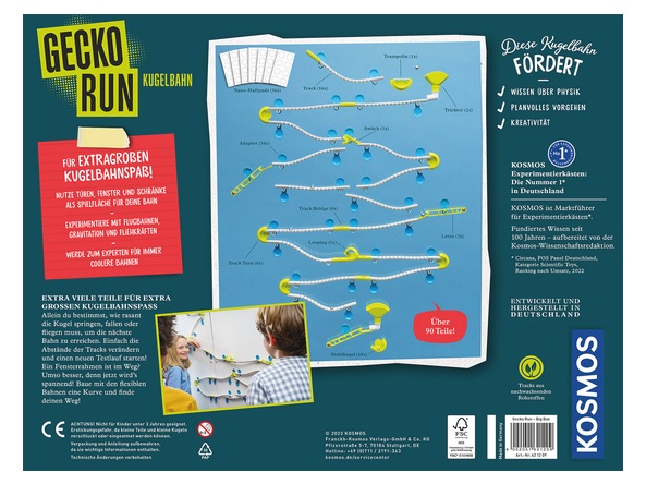 Hier die Gecko Run Big Box von Kosmos: Diese Kugelbahn wird nicht auf dem Boden, sondern vertikal aufgebaut! Bei Gecko Run von Kosmos nutzt ihr glatte senkrechte Flächen in eurer Wohnung - Fensterscheiben, Türen, Fliesen,... - und setzt die Kugelbahnbauteile dort an. In diesem großen Starter Set sind die Erweiterungen Trampolin und Looping schon enthalten!