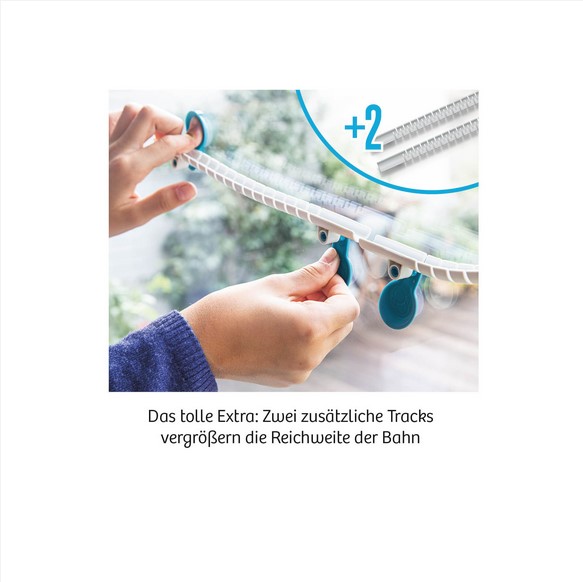 • Inhalt: 1 großes Rad, 1 kleines Rad, 2 Kreisadapter, 2 Tracks, 4 Adapter, 2 Stahlkugeln, 8 Nano-Haftpads, farbig illustrierte Anleitung