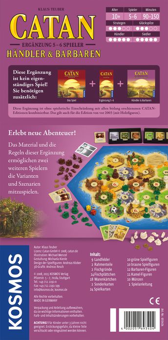 • Achtung: Nur zusammen mit dem Catan Basisspiel, Ergänzug 5-6 und der Händler & Barbaren Ergänzung spielbar!