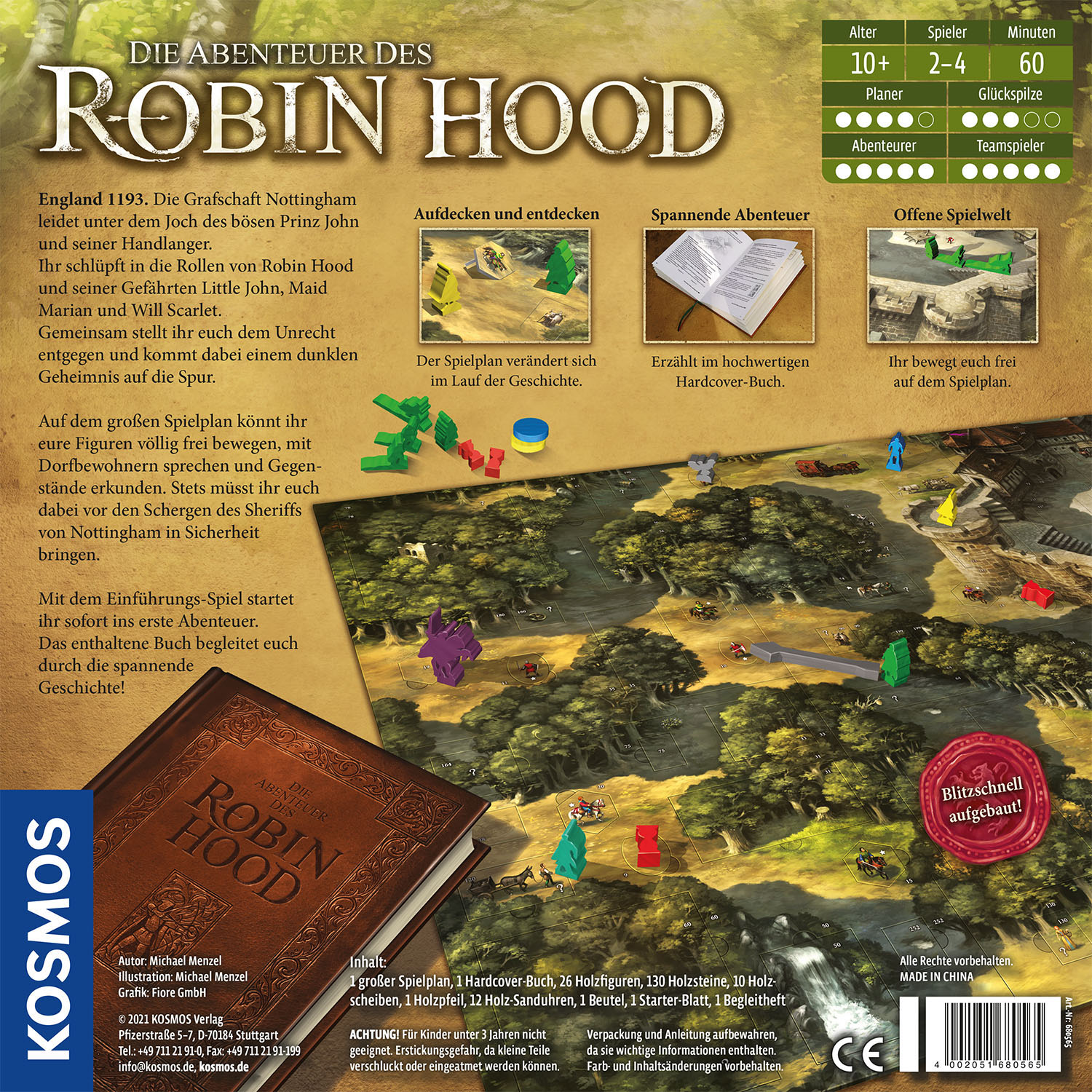 Beim Familienspiel Robin Hood können die Figuren auf dem Spielplan vollkommen frei bewegt werden. Man erkundet die Gegend und flieht vor den Schergen des Sheriffs von Nottingham. Die Spieler erwarten spannende Abenteuer, die im hochwertigen Hardcover-Buch erzählt werden. Im Verlauf der Geschichte verändert sich der Spielplan.