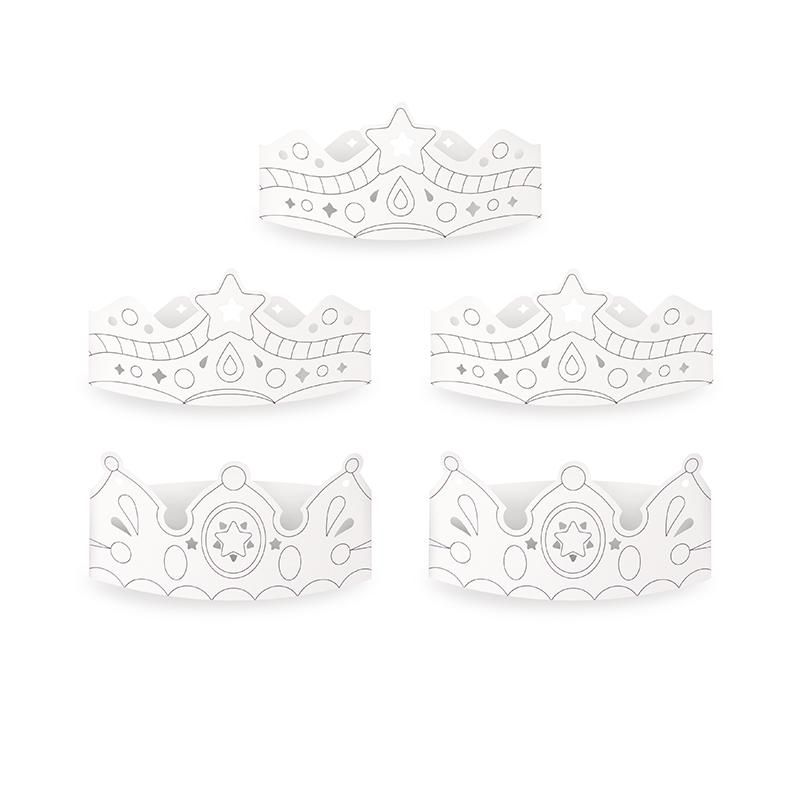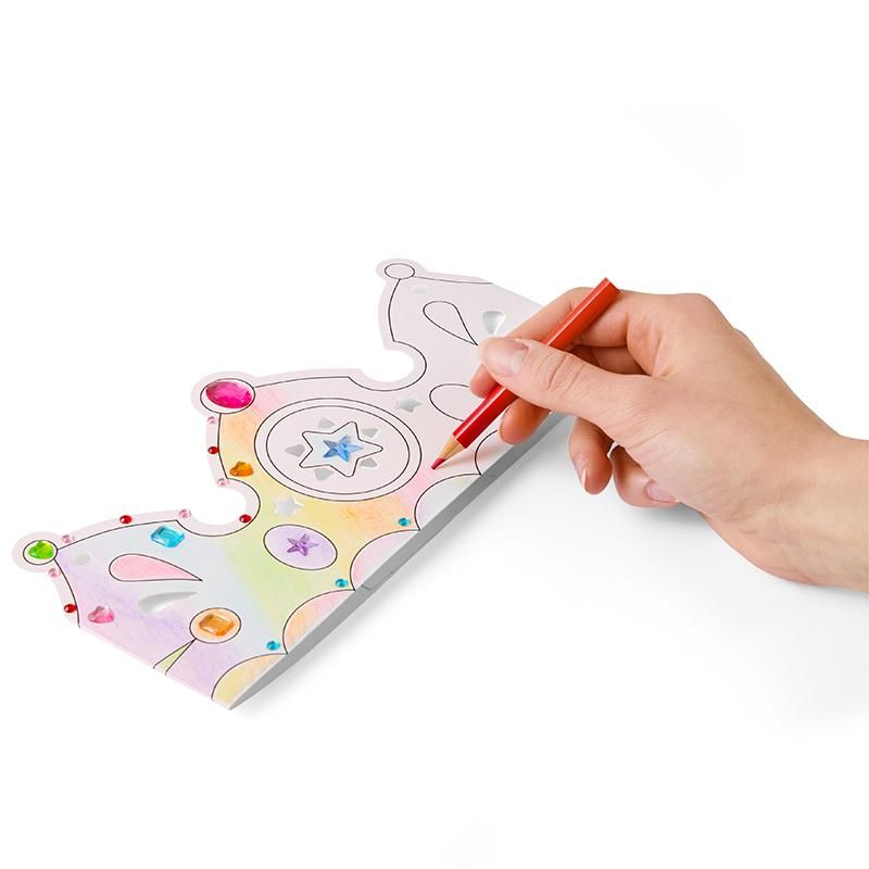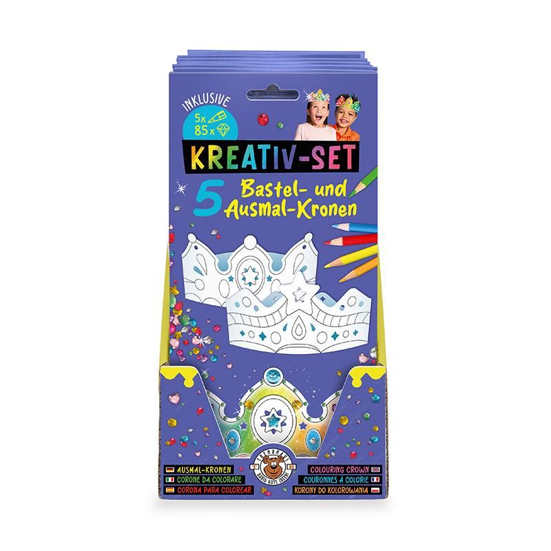 • Inhalt: 5 Papierkronen in 2 Designs, 85 funkelnde Diamantsticker sowie 5 Buntstifte.