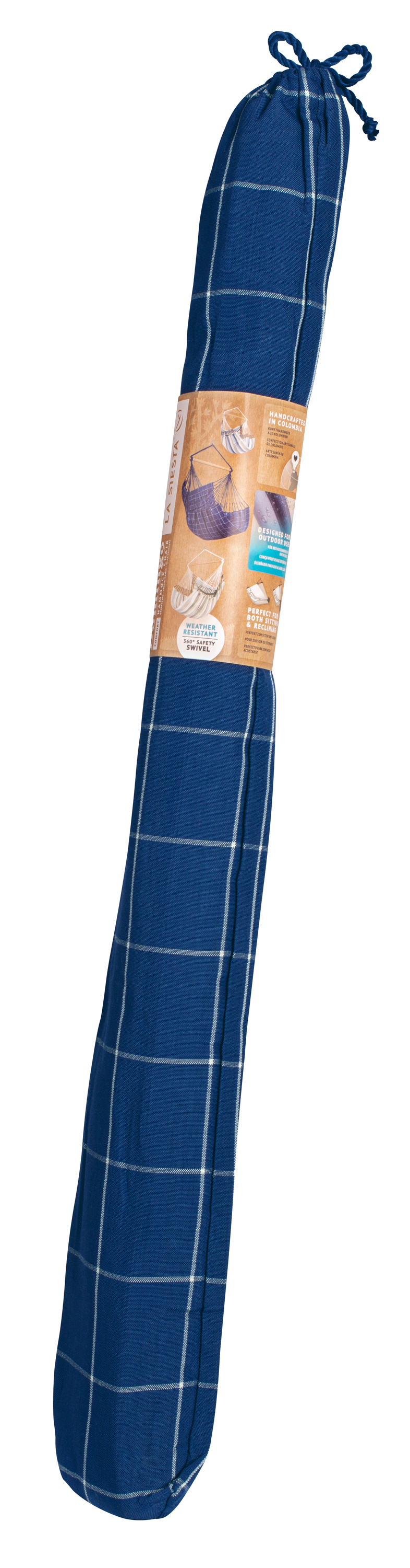 Die Domingo-Serie der La Siesta Hängestühle ist aus wetterbeständigem Outdoorstoff gefertigt. Der Stoff kommt in Webart und Gefühl an der Haut den Baumwollstoffen aber sehr nah. Der Stuhl darf also draussen hängen und fasst sich trotzdem angenehm an. Hier die Farbgebung Marine.