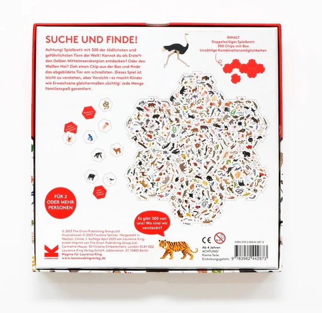 Für das Erste*r sein! Gefährliche Tiere Wimmel-Such-Spiel vom Laurence King Verlag braucht man gute und schnelle Augen: Wer findet zuerst die Tarantula? Und die Klapperschlange? Sie haben sich unter unzähligen anderen Tieren und Symbolen versteckt, schaut genau hin!