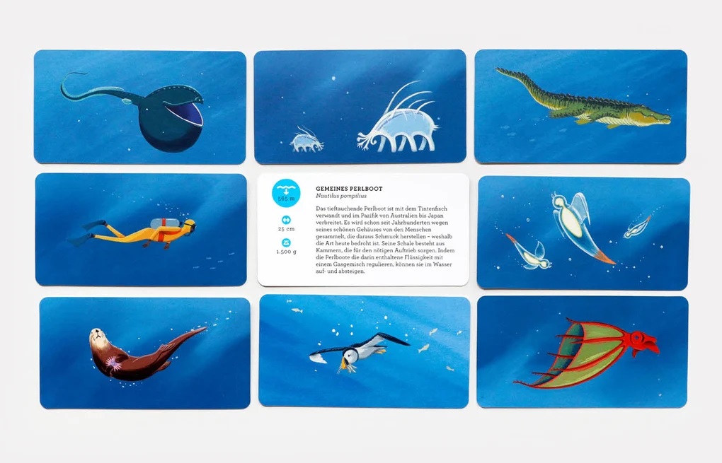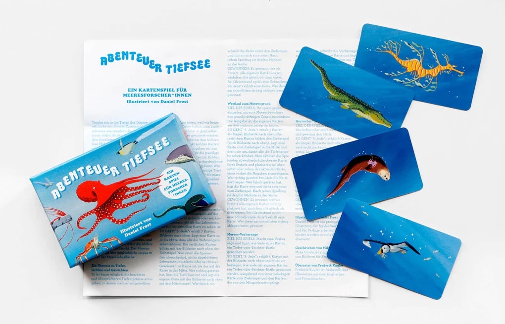 Gleich mehrere Spielideen sind im Kartenspiel Abenteuer Tiefsee vom Laurence King Verlag enthalten. Auf 50 Karten werden die verschiedenen Meeresbewohner vorgestellt, auf der einen Seite als Bild, auf der Rückseite mit Beschreibung.