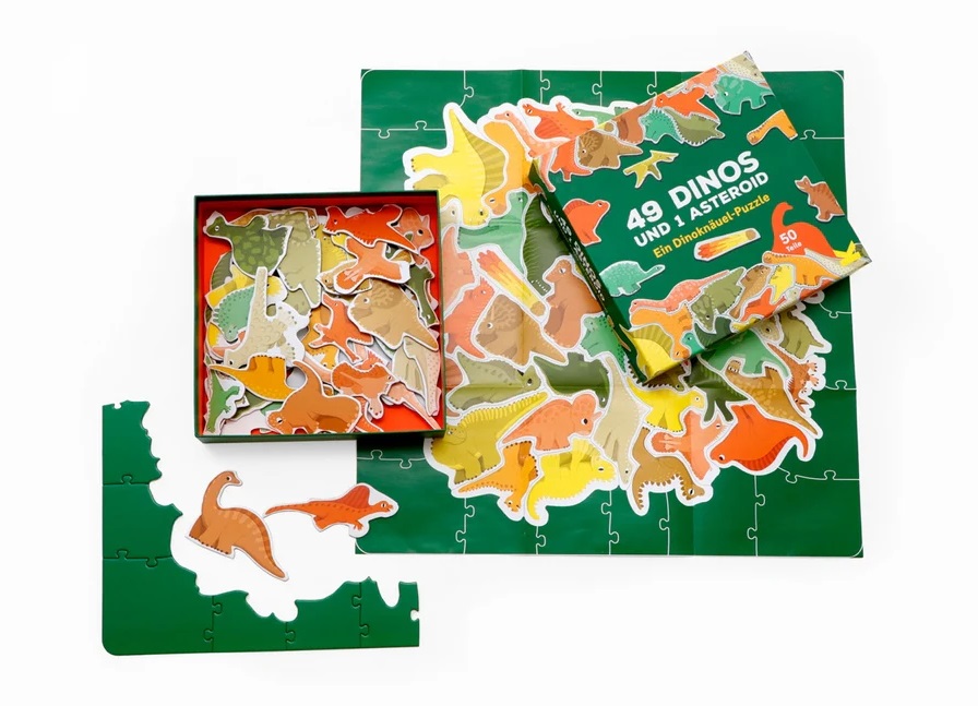 Das Dinoknäuel-Puzzle 49 Dinos und 1 Asteroid vom Laurence King Verlag ist echt uriges Puzzle-Gewusel und Gesuche: 50 lustige Dinos tummeln sich und einer davon ist ein Asterioid!? Also 50 - 1 = 49 Dinos!? Aufgepasst also! Wer findet den Asterioiden?